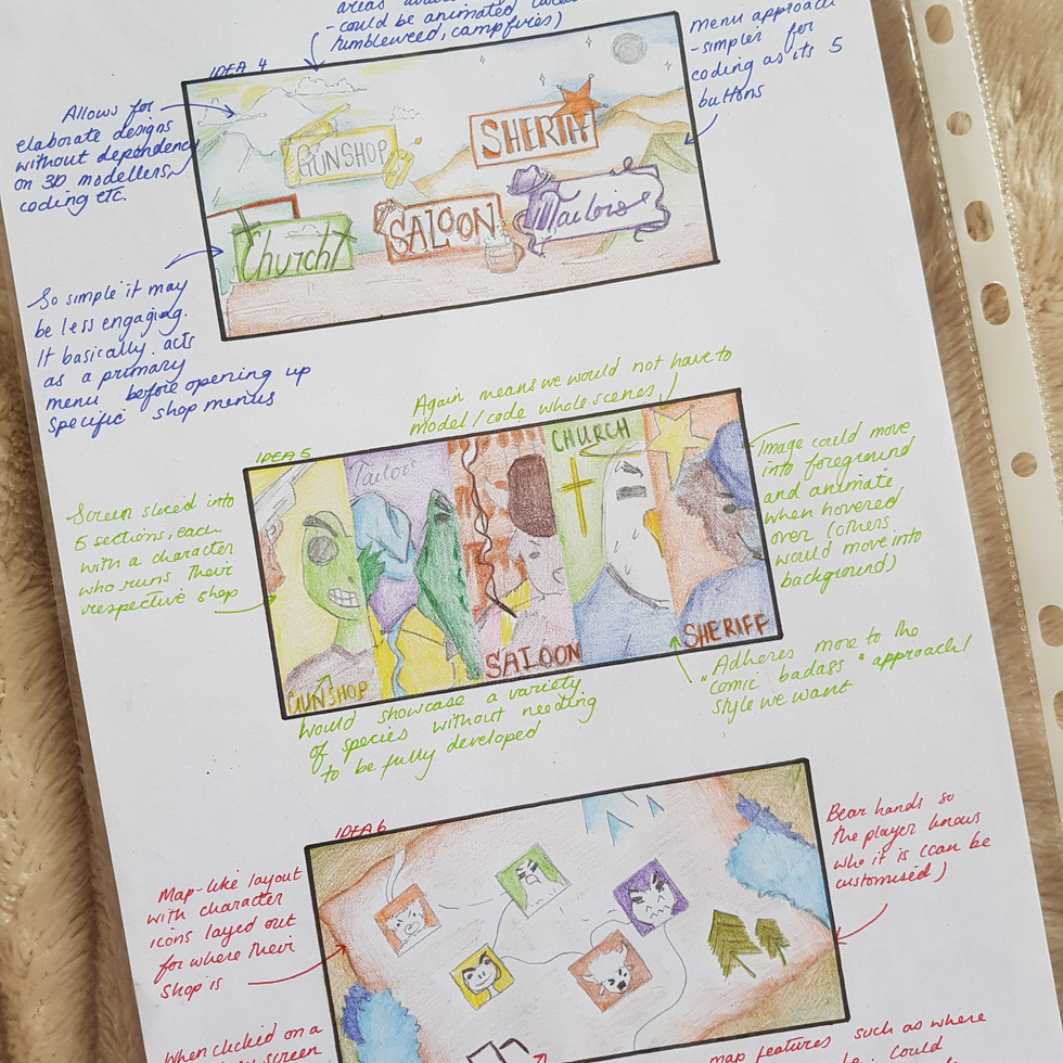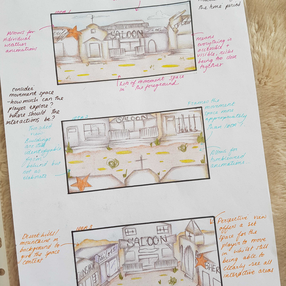 This was also a time to check in with the rest of the group, have a little update on our work and continue to develop our tasks individually. We discussed further elements to the town design as I had put together some more variations of how this 2D area could look. It's important to me that we explore all avenues whenever they arise to achieve the best possible outcome. Below are the ideas I proposed: